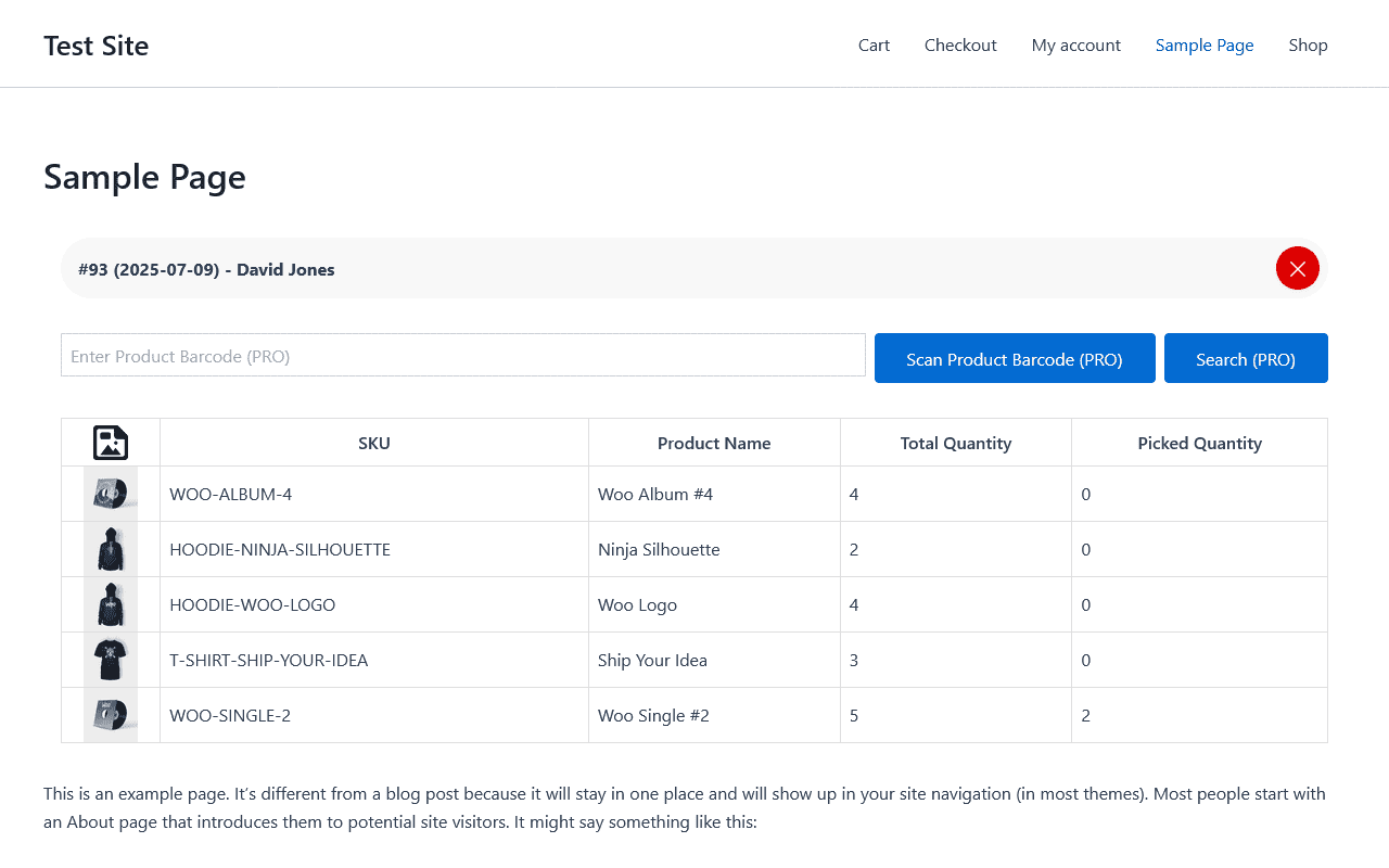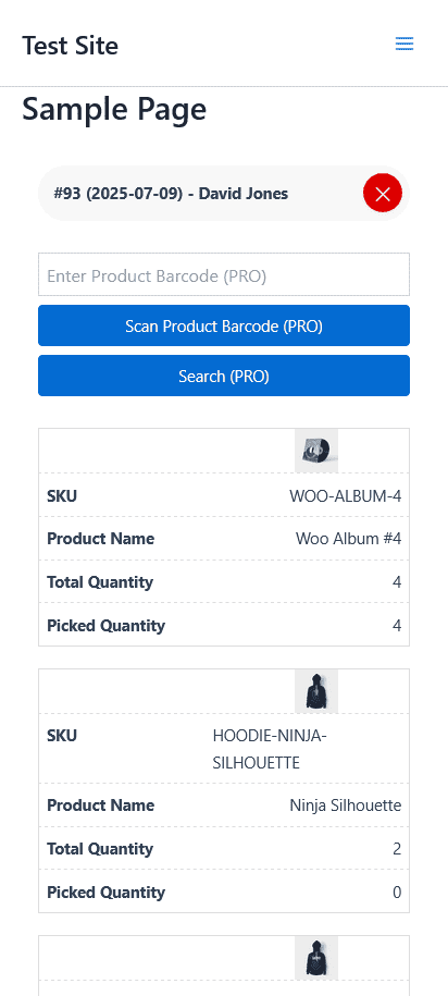 La versione PRO aggiunge campi di ricerca e filtro per SKU e nome prodotto nell'elenco di prelievo prodotti. Questa funzione consente al personale di individuare rapidamente articoli specifici in ordini di grandi dimensioni senza scorrere l'intero elenco. Ad esempio, l'inserimento di un SKU parziale o di un nome prodotto restringe i risultati, facilitando la concentrazione sugli articoli pertinenti. Ciò consente di risparmiare tempo e migliorare la precisione in compiti di prelievo complessi.